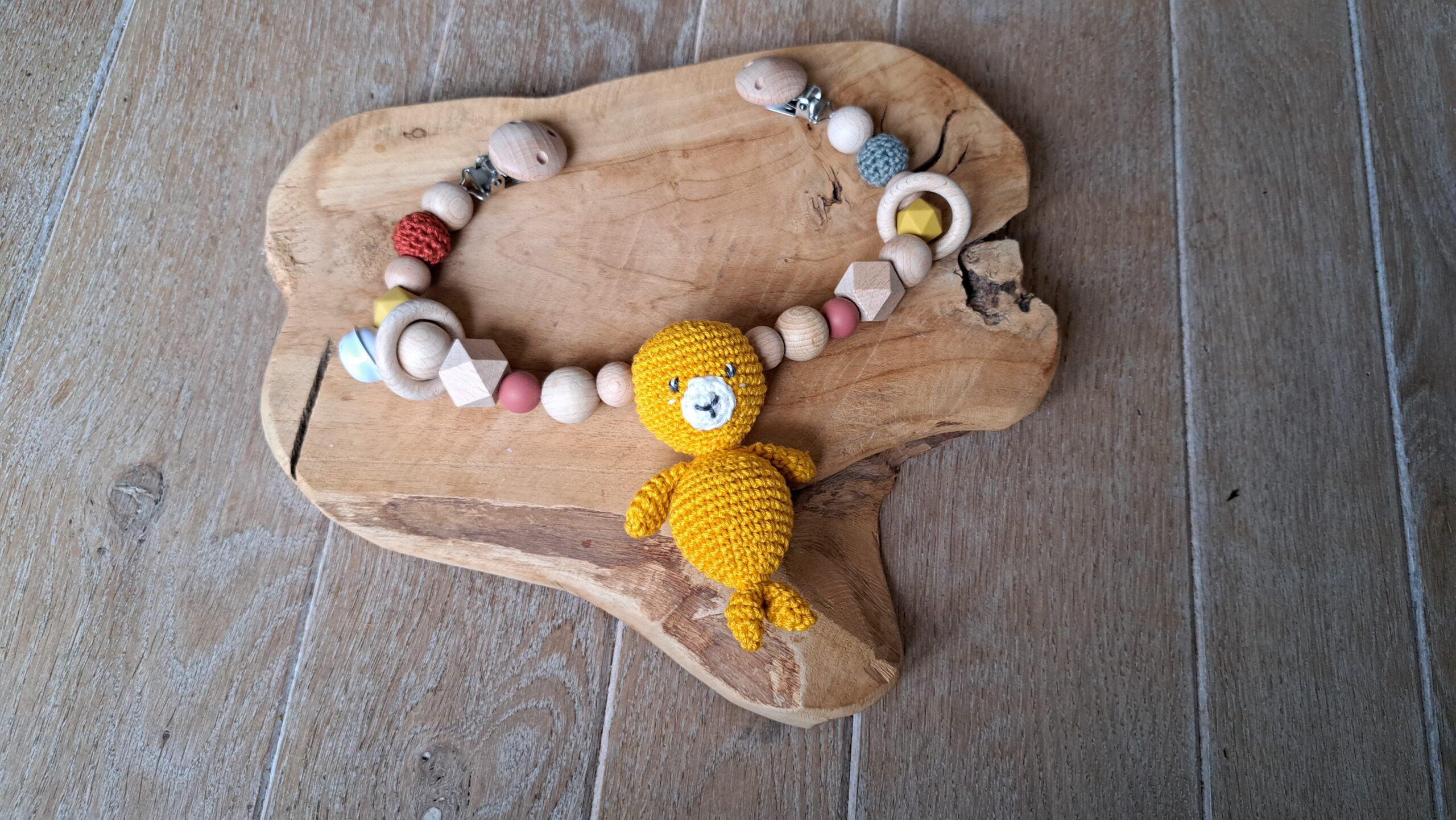 - De kralen zijn gemaakt van natuurlijk hout en van siliconen.